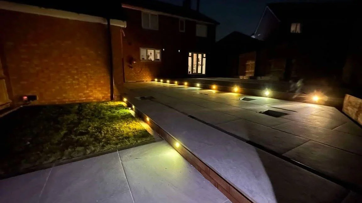 Low-level lighting and porcelain paving to create a usable outdoor space after dark.