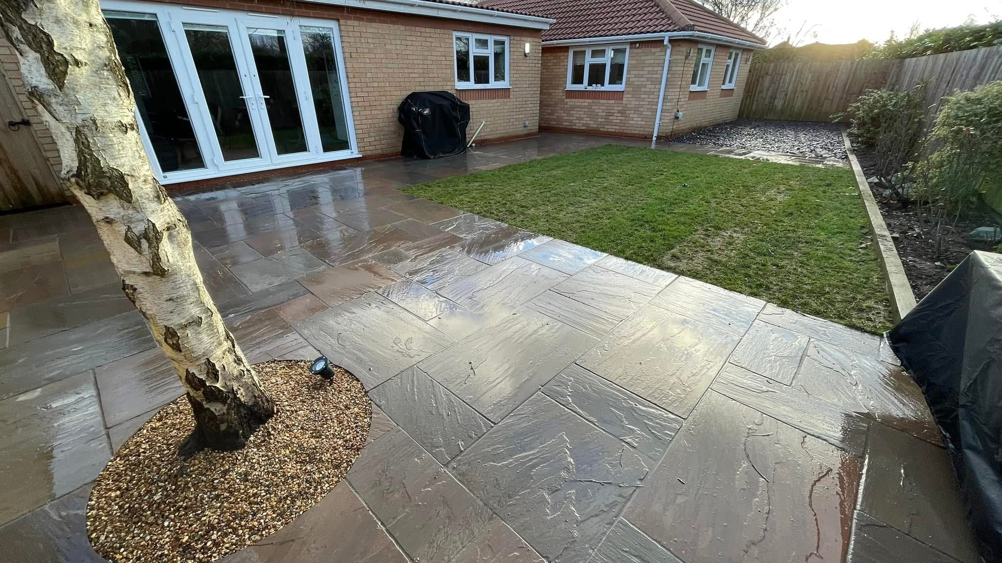 Indian sandstone paving laid with proper ground preparation and drainage.